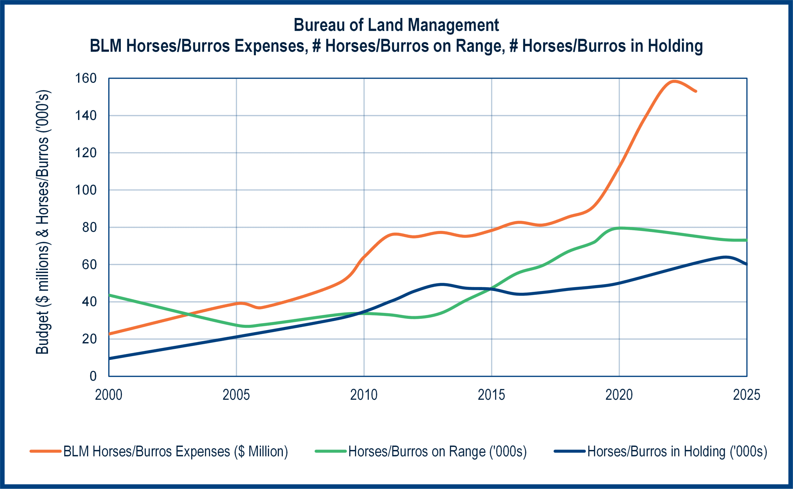 The BLM has designated 177 Herd Management Areas (HMAs) across 10 western states, covering approximately 128,000 square kilometers, about 1.3% of the total area of the United States. According to the BLM, these 177 HMAs can sustainably support around 27,000 horses and burros. This population level was only achieved in 2005 and 2006. Currently, there are approximately 73,000 wild horses and burros within these HMAs. (Please refer to chart below.)